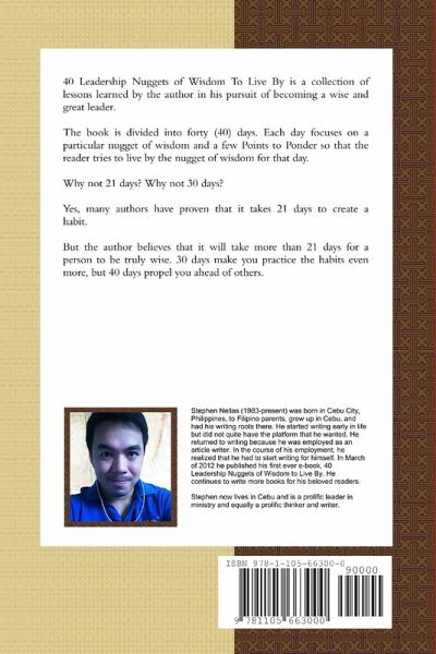 40 Leadership Nuggets of Wisdom To Live By is a collection of lessons learned by the author in his pursuit of becoming a wise and great leader. The book is divided into forty (40) days. Each day focuses on a particular nugget of wisdom and a few Points to Ponder so that the reader tries to live by the nugget of wisdom for that day. Why not 21 days? Why not 30 days? Yes, many authors have proven that it takes 21 days to create a habit. But the author believes that it will take more than 21 days for a person to be truly wise. 30 days make you practice the habits even more, but 40 days propel you ahead of others.