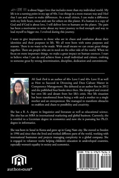 40+ Love III is about bigger love that includes more than my individual world. My life is in a turning point in my age of 40s. I see things in a more mature way and I feel that I can and want to make differences. As a small citizen, I can make a difference with my little heart, sweat and care for others on this planet. If a human is a copy of God and if God is about love, I will deliver love to humans on the planet. The pain has been a motivation to write about my inner journey to find strength and way to lead myself to bigger me. I evolved during this journey. I want to give inspirations to those who are in chaos and confusion about their identities and their purposes in life. We all were born with some purposes and reasons. There is no waste to be made. With small means we can create great things together. There are people who are in need on the other side of the world. When we focus on more important things, we make a great impact on human essences. I start to believe what I can do and achieve from a small individual and citizen, evolving to someone great by strong determination, discipline, dedication and commitment.