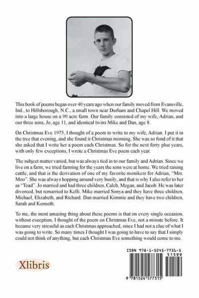 This book of poems began 40 years ago when our family moved from Evansville, Ind., to Hillsborough, N.C., a small town near Durham and Chapel Hill. We moved into a large house on a 90 acre farm. Our family consisted of my wife, Adrian, and our three sons, Jo, age 11, and identical twins Mike and Dan, age 8. On Christmas Eve 1975, I thought of a poem to write to my wife, Adrian. I put it in the tree that evening, and she found it Christmas morning. She was so fond of it that she asked that I write her a poem each Christmas. So for the next forty plus years, with only few exceptions, I wrote a Christmas Eve poem each year. The subject matter varied, but was always tied in to our family and Adrian. Since we live on a farm, we tried farming for the years the sons were at home. We tried raising cattle, and that is the derivation of one of my favorite monikers for Adrian, "Mrs. Moo". She was always hopping around very busily, and that is why I also refer to her as "Toad". Jo married and had three children, Caleb, Megan, and Jacob. He was later divorced, but remarried to Kelli. Mike married Sonya and they have three children, Michael, Elizabeth, and Richard. Dan married Kimmie and they have two children, Sarah and Kenneth. To me, the most amazing thing about these poems is that on every single occasion, without exception, I thought of the poem on Christmas Eve, not a minute before. It became very stressful as each Christmas approached, since I had not a clue of what I was going to write. So many times I thought I was going to have to say that I simply could not think of anything, but each Christmas Eve something would come to me.
