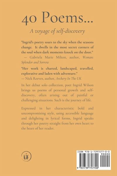 In her debut solo collection, poet Ingrid Wilson brings us poems of personal growth and self-discovery, often arising out of painful or challenging situations. Such is the journey of life. Expressed in her characteristic bold and uncompromising style, using accessible language and delighting in lyrical forms, Ingrid speaks through her poetry straight from her own heart to the heart of her reader.