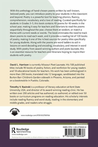 David L. Harrison is currently Missouri Poet Laureate. His 108 published titles include 90 books of poetry, fiction, and nonfiction for young readers and 18 educational books for teachers. His work has been anthologized in more than 200 books, translated into 12 languages, sandblasted into the Burton Barr Children's Garden sidewalk in Phoenix, Arizona, and painted on a bookmobile in Pueblo, Colorado. Timothy V. Rasinski is a professor of literacy education at Kent State University, USA, and director of its award-winning reading clinic. He has written over 200 articles and has authored, co-authored, or edited over 50 books or curriculum programs on reading education. His scholarly interests include reading fluency and word study, reading in the elementary and middle grades, and readers who struggle.