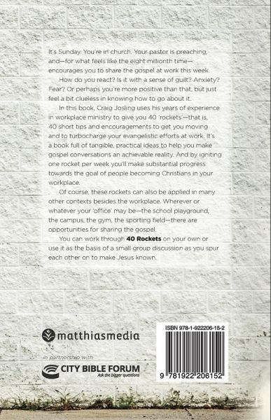 In this book, Craig Josling uses his years of experience in workplace ministry to give you 40 'rockets' - that is, 40 short tips and encouragements to get you moving and to turbocharge your evangelistic efforts at work. It's a book full of tangible, practical ideas to help you make gospel conversations an achievable reality. And by igniting one rocket per week, you'll make substantial progress towards the goal of people coming to know the Lord Jesus in your workplace.