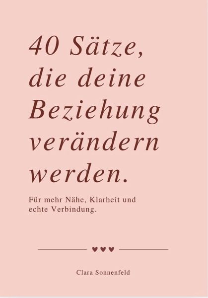 Manchmal entscheiden ein paar Worte, ob wir uns voneinander entfernen - oder näherkommen. Dieses Buch schenkt dir 40 kraftvolle Sätze, die aus Streit Gespräche machen. Aus Rückzug Ehrlichkeit. Und aus Sprachlosigkeit wieder Verbindung. Egal ob du in einer Beziehung feststeckst, dich unverstanden fühlst oder dir einfach mehr Tiefe wünschst: Diese Sätze helfen dir, in schwierigen Momenten das Richtige zu sagen - ohne dich zu verbiegen. Du lernst, wie du: - Grenzen setzen kannst, ohne laut zu werden - Kritik so formulierst, dass sie gehört wird - Nähe wieder aufbaust, auch wenn sie verloren ging - ehrlich bist, ohne zu verletzen Was du bekommst: Ein Buch zum Wiederaufschlagen, Nachdenken und Vorlesen. Ehrlich. Direkt. Berührend. Für alle, die nicht aufgeben wollen - sondern neu anfangen. Weil Beziehung nicht Perfektion braucht - sondern Sprache, die verbindet.