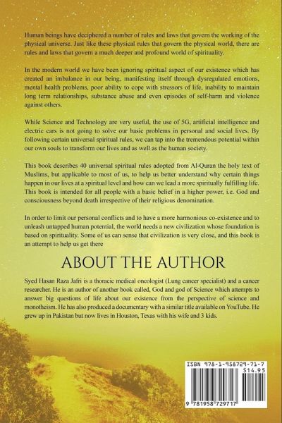Human beings have deciphered a number of rules and laws that govern the working of the physical universe. Just like these physical rules that govern the physical world, there are rules and laws that govern a much deeper and more profound world of spirituality. In the modern world, we have been ignoring spiritual aspects of our existence, which has created an imbalance in our being, manifesting itself through dysregulated emotions, mental health problems, poor ability to cope with stressors of life, inability to maintain long-term relationships, and even episodes of self-harm and violence against others. While science and technology are very useful, the use of 5G, artificial intelligence, and electric cars is not going to solve our basic problems in our personal and social lives. On the other hand, by following certain universal spiritual rules, we can tap into the tremendous potential within our own souls to transform our lives as well as the human society. This book describes forty universal spiritual rules adopted from Al-Quran, the holy text of Muslims, which are applicable to most of us, to help us better understand why certain things happen in our lives at a spiritual level and how can we lead a more spiritually fulfilling life. This book is intended for all people with a basic belief in a higher power, i.e., God and consciousness beyond death, irrespective of their religious denomination. In order to limit our personal conflicts, have a more harmonious co-existence, and unleash untapped human potential, the world needs a new civilization whose foundation is based on spirituality. Some of us can sense that civilization is very close, and this book is an attempt to help us get there. Syed Hasan Raza Jafri is a thoracic medical oncologist (lung cancer specialist) and a cancer researcher. He is the author of another book called God and god of Science which attempts to answer big questions of life about our existence from the perspective of science and monotheism. He has also produced a documentary with a similar title available on YouTube. He grew up in Pakistan but now lives in Houston, Texas with his wife and three kids.