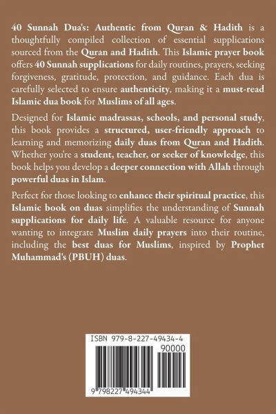 40 Sunnah Dua's: Authentic from Quran & Hadith is a thoughtfully compiled collection of essential supplications sourced from the Quran and Hadith. This Islamic prayer book offers 40 Sunnah supplications for daily routines, prayers, seeking forgiveness, gratitude, protection, and guidance. Each dua is carefully selected to ensure authenticity, making it a must-read Islamic dua book for Muslims of all ages. Designed for Islamic madrassas, schools, and personal study, this book provides a structured, user-friendly approach to learning and memorizing daily duas from Quran and Hadith. Whether you're a student, teacher, or seeker of knowledge, this book helps you develop a deeper connection with Allah through powerful duas in Islam. Perfect for those looking to enhance their spiritual practice, this Islamic book on duas simplifies the understanding of Sunnah supplications for daily life. A valuable resource for anyone wanting to integrate Muslim daily prayers into their routine, including the best duas for Muslims, inspired by Prophet Muhammad's (PBUH) duas.
