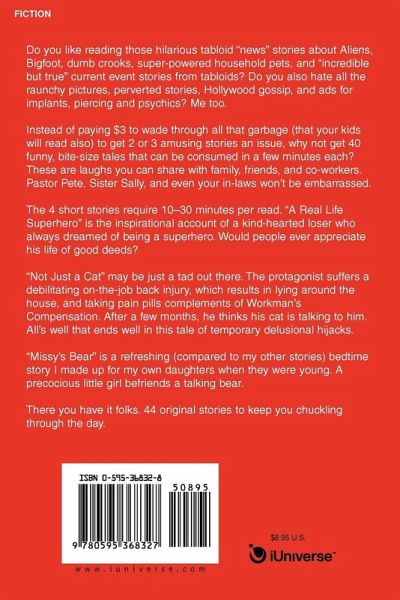 Do you like reading those hilarious tabloid 'news" stories about Aliens, Bigfoot, dumb crooks, super-powered household pets, and 'incredible but true" current event stories from tabloids? Do you also hate all the raunchy pictures, perverted stories, Hollywood gossip, and ads for implants, piercing and psychics? Me too. Instead of paying $3 to wade through all that garbage (that your kids will read also) to get 2 or 3 amusing stories an issue, why not get 40 funny, bite-size tales that can be consumed in a few minutes each? These are laughs you can share with family, friends, and co-workers. Pastor Pete, Sister Sally, and even your in-laws won't be embarrassed. The 4 short stories require 10-30 minutes per read. 'A Real Life Superhero" is the inspirational account of a kind-hearted loser who always dreamed of being a superhero. Would people ever appreciate his life of good deeds? 'Not Just a Cat" may be just a tad out there. The protagonist suffers a debilitating on-the-job back injury, which results in lying around the house, and taking pain pills complements of Workman's Compensation. After a few months, he thinks his cat is talking to him. All's well that ends well in this tale of temporary delusional hijacks. 'Missy's Bear" is a refreshing (compared to my other stories) bedtime story I made up for my own daughters when they were young. A precocious little girl befriends a talking bear. There you have it folks. 44 original stories to keep you chuckling through the day.