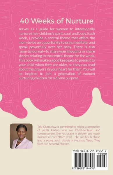 40 Weeks of Nurture serves as a guide for women to intentionally nurture their children's spirit, soul, and body. Each week, I provide a central theme that offers the mom-to-be an opportunity to pray, meditate, and speak powerfully over her baby. There is also room to journal-to share your thoughts or share stories relating to the central theme for the week. This book will make a good keepsake to present to your child, when they are much older, so they can read about the prayers in your heart for them. You'll be inspired to join a generation of women nurturing children for a divine purpose. I encourage mothers who are not pregnant to take a 40-week journey with this book and intentionally pray over your child/children. Each page is your connection to the hopes, dreams, and aspirations you have for your little one(s). For expecting moms - women who are trusting to be pregnant - pray these prayers ahead, trusting that someday you, too, would have the opportunity to present this book to your child.