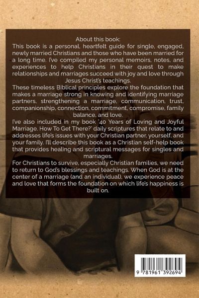 About this book: This book is a personal, heartfelt guide for single, engaged, newly married Christians and those who have been married for a long time. I've compiled my personal memoirs, notes, and experiences to help Christians in their quest to make relationships and marriages succeed with joy and love through Jesus Christ's teachings. These timeless Biblical principles explore the foundation that makes a marriage strong in knowing and identifying marriage partners, strengthening a marriage, communication, trust, companionship, connection, commitment, compromise, family balance, and love. I've also included in my book 40 Years of Loving and Joyful Marriage. How To Get There?' daily scriptures that relate to and address life's issues with your Christian partner, yourself, and your family. I'll describe this book as a Christian self-help book that provides healing and scriptural messages for singles and marriages. For Christians to survive, especially Christian families, we need to return to God's blessings and teachings. When God is at the center of a marriage (and an individual), we experience peace and love that forms the foundation on which life's happiness is built.