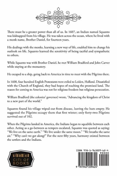 There must be a greater power than all of us. In 1607, an Indian named Squanto was kidnapped from his village. He was taken across the ocean, where he lived with a monk name, Brother Daniel, for fourteen years. His dealings with the monks, learning a new way of life, enabled him to change his outlook on life. Squanto learned the sensitivity of being tactful and sympathetic to others. While Squanto was with Brother Daniel, he met William Bradford and John Carver while staying at the monastery. He escaped to a ship, going back to America in time to meet with the Pilgrims there. In 1608, four hundred English Protestants were exiled to Leiden, Holland. Dissatisfied with the Church of England, they had hopes of reaching the promised land. The reason for coming to America was not for religious freedom but religious persecution. William Bradford (the colonies' governor) wrote, "Advancing the kingdom of Christ to a new part of the world." Squanto found his village wiped out from disease, leaving the huts empty. He suggested the Pilgrims occupy them that first winter; only forty-two Pilgrims survived out of 102. When the Pilgrims landed in America, the Indians began to squabble between each other. Acting as a go-between as tempers escalated, Squanto was quoted as saying: "We live on the same earth." "We live under the same moon." "We breathe the same air." "Why can't we get along?" For the next fifty years, harmony existed between the settlers and the Indians.