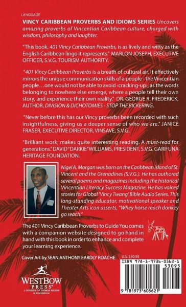 VINCY CARIBBEAN PROVERBS AND IDIOMS SERIES Uncovers amazing proverbs of Vincentian Caribbean culture, charged with wisdom, philosophy and laughter. "This book, 401 Vincy Caribbean Proverbs, is as lively and witty as the English Caribbean lingo it represents." MARLON JOSEPH, EXECUTIVE OFFICER, S.V.G. TOURISM AUTHORITY. "401 Vincy Caribbean Proverbs is a breath of cultural air. It effectively mirrors the unique communication skills of a people - the Vincentian people…one would not be able to avoid ‹cracking-up›, as the words belonging to nowhere else emerge, where a people tell their own story, and experience their own reality." DR. GEORGE R. FREDERICK, AUTHOR, DIVISION & DICHOTOMIES - STOP THE BICKERING. "Never before this has our Vincy proverbs been recorded with such insightfulness, giving us a deeper sense of who we are." JANICE FRASER, EXECUTIVE DIRECTOR, VINSAVE, S.V.G. "Brilliant work; makes quite interesting reading. A must-read for generations." DAVID "DARKIE" WILLIAMS, PRESIDENT, S.V.G. GARIFUNA HERITAGE FOUNDATION. The 401 Vincy Caribbean Proverbs to Guide You comes with a companion website designed to go hand in hand with this book in order to enhance and complete your learning experience.