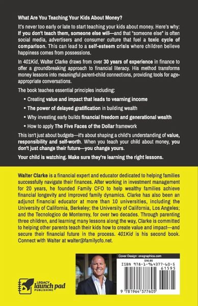 What Are You Teaching Your Kids About Money? It's never too early or late to start teaching your kids about money. Here's why: If you don't teach them, someone else will and that "someone else" is often social media, advertisers and consumer culture that fuel a toxic cycle of comparison. This can lead to a self-esteem crisis where children believe happiness comes from possessions. In 401Kid, Walter Clarke draws from over 30 years of experience in finance to offer a groundbreaking approach to financial literacy. His method transforms money lessons into meaningful parent-child connections, providing tools for age-appropriate conversations. The book teaches essential principles including: Creating value and impact that leads to earning income The power of delayed gratification in building wealth Why investing early builds financial freedom and generational wealth How to apply The Five Faces of the Dollar framework This isn't just about budgets-it's about shaping a child's understanding of value, responsibility and self-worth. When you teach your child about money, you don't just change their future-you change yours. Your child is watching. Make sure they're learning the right lessons.