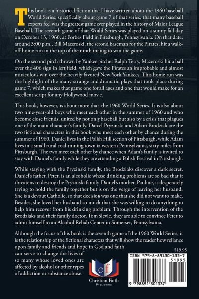 This book is a historical fiction that I have written about the 1960 baseball World Series, specifically about game 7 of that series, that many baseball experts feel was the greatest game ever played in the history of Major League Baseball. The seventh game of that World Series was played on a sunny fall day on October 13, 1960, at Forbes Field in Pittsburgh, Pennsylvania. On that date, around 3:00 p.m., Bill Mazeroski, the second baseman for the Pirates, hit a walk- off home run in the top of the ninth inning to win the game. On the second pitch thrown by Yankee pitcher Ralph Terry, Mazeroski hit a ball over the 406 sign in left field, which gave the Pirates an improbable and almost miraculous win over the heavily favored New York Yankees. This home run was the highlight of the many strange and dramatic plays that took place during game 7, which makes that game one for all ages and one that would make for an excellent script for any Hollywood movie. This book, however, is about more than the 1960 World Series. It is also about two nine-year-old boys who meet each other in the summer of 1960 and who become close friends, united by not only baseball but also by a crisis that plagues one of the main character's family. Daniel Pryzinski and Adam Brodziak are the two fictional characters in this book who meet each other by chance during the summer of 1960. Daniel lives in the Polish Hill section of Pittsburgh, while Adam lives in a small rural coal-mining town in western Pennsylvania, sixty miles from Pittsburgh. The two meet each other by chance when Adam's family is invited to stay with Daniel's family while they are attending a Polish Festival in Pittsburgh. While staying with the Pryzinski family, the Brodziaks discover a dark secret. Daniel's father, Peter, is an alcoholic whose drinking problems are so bad that it threatens to destroy the Pryzinski family. Daniel's mother, Pauline, is desperately trying to hold the family together but is on the verge of leaving her husband. She is a devout Catholic, so that decision was one that she did not want to make. Besides, she loved her husband so much that she was willing to do anything to help him recover from his drinking problem. Through the intervention of the Brodziaks and their family doctor, Tom Slevic, they are able to convince Peter to admit himself to an Alcohol Rehab Center in Somerset, Pennsylvania. Although the focus of this book is the seventh game of the 1960 World Series, it is the relationship of the fictional characters that will show the reader how reliance upon family and friends and hope in God and faith can serve to change the lives of so many whose loved ones are affected by alcohol or other types of addiction or substance abuse.