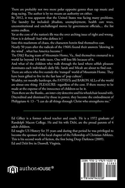 There are probably not two more polar opposite genres than rap music and drag racing. The author is by no means an authority on either. By 2012, it was apparent that the United States was facing many problems. The laundry list included: jihadists, unemployment, health care woes, unconstitutional and unchallenged moves by government officials,... the list seems endless. Yet at the core of the nation's ills was the over arching issue of right and wrong. How is it defined? And who defines it ? Into this maelstrom of chaos, the characters herein find themselves cast. Nearly 50 years after the radicals of the 1960's found their answers 'blowing in the wind' , what has America become ? The D&J Racing team of Mountain Home, Va., find themselves ensnared in a world far beyond 1/4 mile races. One will lose life because of it. And what of the children who walk through the land where selfish pleasure dominates each individual's daily life. Sarah and Micah are about to find out. There are others who live outside the 'tranquil' world of Mountain Home. They have been gifted to live in the fast lane of 'pop culture'. Wealthy, yet morally bankrupt, the FATFISTs and BARON ALLs of the world are about one thing- PLEASURE- regardless of the cost. If there money to be made at the expense of the innocence of children-so be it. Then there are the Runks...an inter-city detective and his wheelchair bound wife. Discredited and dismissed by those in power, they become the embodiment of Philippians 4: 13 - "I can do all things through Christ who strengthens me."