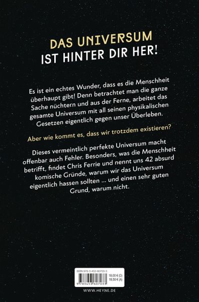 Das Universum, dieses perfekte und faszinierende System, macht offenbar auch Fehler. Besonders was die Menschheit betrifft, findet Chris Ferrie. Alles um uns herum kann uns töten, buchstäblich alles ist Gift für uns, selbst der Sauerstoff, den wir zum Atmen brauchen. Die Erdatmosphäre ist so einzigartig, dass wir damit auf der Erde gefangen sind und vermutlich nirgendwo anders leben können. Dazu noch die ewig währende Frage: Sind wir allein im Universum? Oder gibt es einen anderen Grund, warum wir noch immer kein außerirdisches Leben finden konnten? Chris Ferrie nimmt uns in "42 Gründe, das Universum zu hassen" mit auf eine unterhaltsame Erkundungsreise durch unser Universum und die Welt, wie wir sie zu kennen glauben, und zeigt uns, dass die Menschheit es nur sich selbst zu verdanken hat, dass sie heute noch am Leben ist. Doch auch in all dieser Dunkelheit gibt es einen Hoffnungsschimmer. Den einen Grund, warum wir das Universum trotzdem lieben sollten. Warum es faszinierend, großartig und trotz aller Widrigkeiten wunderschön ist, dieses Universum erforschen zu können.
