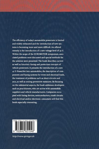The efficiency of today's automobile PowerNets is limited and widely exhausted and the introduction of new systems is becoming more and more difficult. An offered remedy is the introduction of a new voltage level of 42 V. Within the scope of the EUROMOTOR symposium, associated problems were discussed and special methods for the solution were presented. The book describes current as well as futuristic fusing and protection concepts of vehicle PowerNets. It presents the introduction of a new 42 V-PowerNet into automobiles, the description of components and fusing systems for wires and electrical loads, the treatment of problems such as short-circuits and arcs, as well as seizing preventive measures. By focusing on the substantial aspects, the book addresses developers such as practitioners, who are active with automobile suppliers and vehicle manufacturers. Companies occupied with fusing devices, semiconductors, trunk circuits and electrical and/or electronic consumers will find this book especially interesting.
