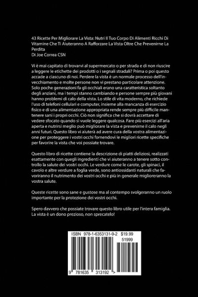 43 Ricette Per Migliorare La Vista: Nutri Il Tuo Corpo Di Alimenti Ricchi Di Vitamine Che Ti Aiuteranno A Rafforzare La Vista Oltre Che Prevenirne La Perdita Di Joe Correa CSN Vi è mai capitato di trovarvi al supermercato o per strada e di non riuscire a leggere le etichette dei prodotti o i segnali stradali? Prima o poi questo accade a ciascuno di noi. Perdere la vista è un normale processo dell'invecchiamento e molte persone non vi prestano particolare attenzione. Solo poche generazioni fa gli occhiali erano una caratteristica soltanto degli anziani, ma i tempi stanno cambiando e persone sempre più giovani hanno problemi di calo della vista. Lo stile di vita moderno, che richiede l'uso di telefoni cellulari e computer, insieme alla mancanza di esercizio fisico e di una alimentazione appropriata rende sempre più difficile mantenere sani i propri occhi. Ciò non significa che si dovrà accettare di vedere sfocato quando si vuole leggere qualcosa. Fare più esercizi all'aria aperta e nutrirsi meglio può migliorare la vista e prevenirne il calo negli anni futuri. Questo libro vi aiuterà ad avere cura della vostra alimentazione per proteggere i vostri occhi fornendovi le migliori ricette specifiche per favorire la vista che voi possiate trovare. E' innegabile che il nostro lavoro si svolga principalmente davanti ai computer, e ciò avviene ogni giorno per almeno 8 ore, ma possiamo fare del nostro meglio per aiutare il nostro corpo a guarire attraverso l'alimentazione. La vista è un dono prezioso ed insostituibile ed è per questo che l'argomento è da prendere seriamente. La prima cosa che dovreste fare è quella di evitare di stare inutilmente davanti alla tv o ad altri strumenti elettronici. E' ormai provato il fatto che danneggiano gli occhi e rappresentano il primo motivo di perdita della vista. Anziché trascorrere tutto il pomeriggio davanti alla televisione, uscite a portare a spasso il vostro cane o a godervi una bella corsa. Tutte le verdure arancioni, rosse e gialle contengono un grande quantitativo di carotenoidi, uno degli elementi principali per la salute degli occhi. Ecco perché ho raccolto molte ricette a base di pomodori, patate dolci, carote e peperoni. Queste ricette sono sane e gustose ma al contempo svolgeranno un ruolo importante per la protezione dei vostri occhi. Spero davvero che possiate trovare questo libro utile per l'intera famiglia. La vista è un dono prezioso, non sprecatelo!