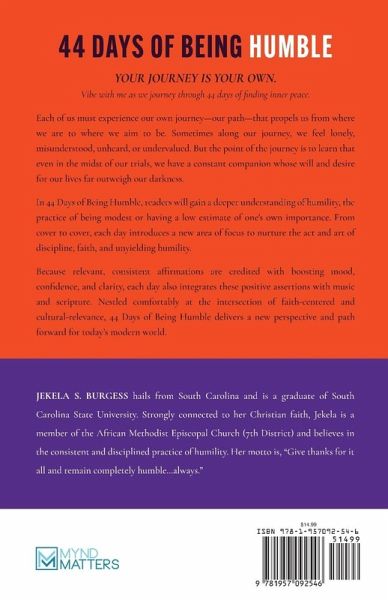 YOUR JOURNEY IS YOUR OWN. Vibe with me as we journey through 44 days of finding inner peace. Each of us must experience our own journey-our path-that propels us from where we are to where we aim to be. Sometimes along our journey, we feel lonely, misunderstood, unheard, or undervalued. But the point of the journey is to learn that even in the midst of our trials, we have a constant companion whose will and desire for our lives far outweigh our darkness. In 44 Days of Being Humble, readers will gain a deeper understanding of humility, the practice of being modest or having a low estimate of one's own importance. From cover to cover, each day introduces a new area of focus to nurture the act and art of discipline, faith, and unyielding humility. Because relevant, consistent affirmations are credited with boosting mood, confidence, and clarity, each day also integrates these positive assertions with music and scripture. Nestled comfortably at the intersection of faith-centered and cultural relevance, 44 Days of Being Humble delivers a new perspective and path forward for today's modern world.