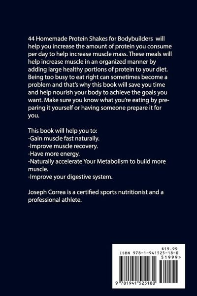 44 Homemade Protein Shakes for Bodybuilders will help you increase the amount of protein you consume per day to help increase muscle mass. These meals will help increase muscle in an organized manner by adding large healthy portions of protein to your diet. Being too busy to eat right can sometimes become a problem and that's why this book will save you time and help nourish your body to achieve the goals you want. Make sure you know what you're eating by preparing it yourself or having someone prepare it for you. This book will help you to: -Gain muscle fast naturally. -Improve muscle recovery. -Have more energy. -Naturally accelerate Your Metabolism to build more muscle. -Improve your digestive system. Joseph Correa is a certified sports nutritionist and a professional athlete.