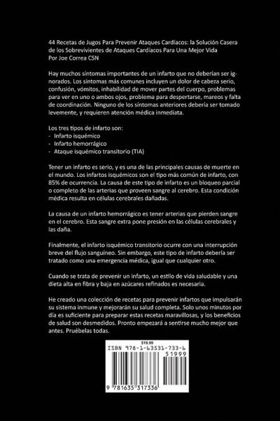 44 Recetas de Jugos Para Prevenir Ataques Cardíacos: la Solución Casera de los Sobrevivientes de Ataques Cardíacos Para Una Mejor Vida Por Joe Correa CSN Hay muchos síntomas importantes de un infarto que no deberían ser ignorados. Los síntomas más comunes incluyen un dolor de cabeza serio, confusión, vómitos, inhabilidad de mover partes del cuerpo, problemas para ver en uno o ambos ojos, problema para despertarse, mareos y falta de coordinación. Ninguno de los síntomas anteriores debería ser tomado levemente, y requieren atención médica inmediata. Los tres tipos de infarto son: Infarto isquémico Infarto hemorrágico - Ataque isquémico transitorio (TIA) Tener un infarto es serio, y es una de las principales causas de muerte en el mundo. Los infartos isquémicos son el tipo más común de infarto, con 85% de ocurrencia. La causa de este tipo de infarto es un bloqueo parcial o completo de las arterias que proveen sangre al cerebro. Esta condición médica resulta en células cerebrales dañadas. La causa de un infarto hemorrágico es tener arterias que pierden sangre en el cerebro. Esta sangre extra pone presión en las células cerebrales y las daña. Finalmente, el infarto isquémico transitorio ocurre con una interrupción breve del flujo sanguíneo. Sin embargo, este tipo de infarto debería ser tratado como una emergencia médica, igual que cualquier otro. Cuando se trata de prevenir un infarto, un estilo de vida saludable y una dieta alta en fibra y baja en azúcares refinados es necesaria. He creado una colección de recetas para prevenir infartos que impulsarán su sistema inmune y mejorarán su salud completa. Solo unos minutos por día es suficiente para preparar estas recetas maravillosas, y los beneficios de salud son desmedidos. Pronto empezará a sentirse mucho mejor que antes. Pruébelas todas.