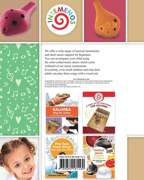 My sheet music includes fingering positions, letter-coded notation, and song lyrics for a 6-hole ocarina. Although your ocarina has just 6 holes, this small instrument can produce 10 natural notes, the full range from C to C, plus D and E of the next octave and 7 flat and sharp notes: a total of 17 notes. The fingering positions are shown in the book graphically on an image of a standard shaped ocarina with six holes. The Ocarina can produce a basic scale plus semitone notes, so you can still play more challenging chromatic melodies with it. My sheet music is based on a 6-hole ocarina tuned in C Major. It covers a pitch range from ¿5 to E6 and is capable of sharps and flats. C major 6-hole ocarina, which is the most popular model on the market. However, you can have E, F, G, B, and B-flat major ocarinas, which have different fingerings. Be careful, you've been warned. Contents A Tisket, a Tasket Are You Sleeping Auld Lang Syne Aura Lee Au Clair de la Lune Baa, Baa Black Sheep Bingo Bye Baby Bunting Happy Birthday Here We Go Round the Mulberry Bush Hey, Diddle Diddle Hickory Dickory Dock Hot Cross Buns Humpty Dumpty I'm a Little Teapot If You're Happy and You Know It Itsy Bitsy Spider Jingle Bells Jolly Old Saint Nicholas Kumbaya Lavender's Blue Little Jack Horner London Bridge Mary Had a Little Lamb Misty Mountains My Bonny Lies Over the Ocean O, Christmas Tree (O, Tannenbaum) Oh My Darling, Clementine Old MacDonald Had a Farm Rain, Rain, Go Away Pop! Goes the Weasel Ring Around the Rosie Row Row Row Your Boat The Bear Went Over the Mountain The First Noel The Muffin Man This Old Man The Wheels on the Bus Ten Little Fingers Twinkle, Twinkle Little Star We Wish You a Merry Christmas When the Saints Go Marching In What Shall We Do With the Drunken Sailor 99 Bottles of Beer