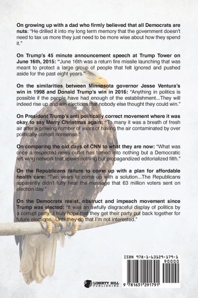 On growing up with a dad who firmly believed that all Democrats are nuts: "He drilled it into my long term memory that the government doesn't need to tax us more they just need to be more wise about how they spend it." On Trump's 45 minute announcement speech at Trump Tower on June 16th, 2015: "June 16th was a return fire missile launching that was meant to protect a large group of people that felt ignored and pushed aside for the past eight years." On the similarities between Minnesota governor Jesse Ventura's win in 1998 and Donald Trump's win in 2016: "Anything in politics is possible if the people have had enough of the establishment...They will indeed rise up and win elections that nobody else thought they could win." On President Trump's anti politically correct movement where it was okay to say Merry Christmas again: "To many it was a breath of fresh air after a growing number of years of having the air contaminated by over politically correct nonsense." On comparing the old days of CNN to what they are now: "What was once a respected news outlet has turned into nothing but a Democratic left wing network that spews nothing but propagandized editorialized filth." On the Republicans failure to come up with a plan for affordable health care: "Two years to come up with a solution...The Republicans apparently didn't fully hear the message that 63 million voters sent on election day." On the Democrats resist, obstruct and impeach movement since Trump was elected: "It was an awfully disgraceful display of politics by a corrupt party...I truly hope that they get their party put back together for future elections. Until they do that I'm not interested."