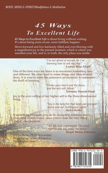 45 Ways to Excellent Life is about living without waiting. It’s about being more aware, more fulfilled, happier. One way to become more aware is by actions. Actively involve yourself in one of the meditations in this book each day—or spend any number of days on one if it intrigues you, edifies you and makes your life richer. Move toward you goals with love and anticipation. Little goals make big changes. Big goals are transformative. Don’t be shy, cautious, self-critical. Goals you’ve not acted upon but that still lay nested quietly and hopeful are your gifts to yourself, and potential gifts to the world. Step out bravely. Sometimes the greatest act of bravery is facing one’s self ....