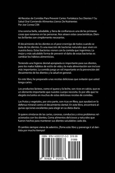 46 Recetas de Comidas Para Prevenir Caries: Fortalezca Sus Dientes Y Su Salud Oral Comiendo Alimentos Llenos De Nutrientes Por Joe Correa CSN Una sonrisa bella, saludable, y llena de confianza es una de las primeras cosas que notamos en las personas. Nos atraen estas características. Dientes brillantes son simplemente necesarios. La mayoría de los doctores concuerdan en que los dientes son extremadamente importantes para la salud en general, y están conectados con el resto del cuerpo de tal manera que pueden hacer mucho daño si se los deja en mala forma. El decaimiento de los dientes es el peor enemigo de todos cuando se trata de los dientes. Es una reacción de bacterias naturales que viven en nuestra boca. Estas bacterias vienen con la comida que ingerimos. La mejor y más saludable forma de prevenir el daño de estas bacterias es cambiar los hábitos alimenticios. Teniendo una higiene dental apropiada es importante para sus dientes, pero los malos hábitos de estilo de vida y la mala alimentación son incluso más importantes. La comida juega un rol importante en la prevención del decaimiento de los dientes y la salud en general. En este libro, he preparado unas recetas deliciosas que evitarán que usted tenga caries. Los productos lácteos, como el queso y la leche, son ricos en calcio, que es un elemento importante que nuestro cuerpo necesita. Es por ello que he elegido incluirlos en muchas de estas deliciosas recetas de comidas. Las frutas y vegetales, por otra parte, son ricas en fibra, que ayudará en la defensa mineral contra el decaimiento dental. En este libro, encontrará algunas opciones excelentes para elegir en su dieta diaria. Si quiere olvidarse de las caries, coronas, conductos y otros problemas relacionados con los dientes, Coma alimentos deliciosos y naturales que fueron hechos para mantener sus dientes saludables cada día. El cambio siempre viene de adentro. ¡Tome este libro y prevenga ir al dentista por mucho tiempo!