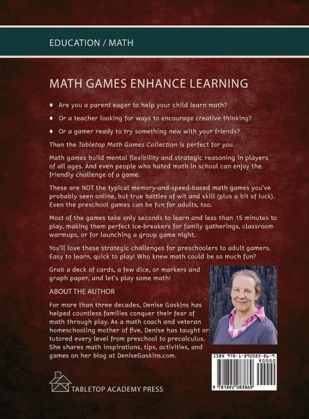 Math Games Enhance Learning Math games build mental flexibility and strategic reasoning in players of all ages. And even people who hated math in school can enjoy the friendly challenge of a game. These are NOT the typical memory-and-speed-based math games you've probably seen online, but true battles of wit and skill (plus a bit of luck). Even the preschool games can be fun for adults, too. Most of the games take only seconds to learn and less than 15 minutes to play, making them perfect ice-breakers for family gatherings, classroom warmups, or for launching a group game night. You'll love these strategic challenges for preschoolers to adult gamers. Easy to learn, quick to play! Who knew math could be so much fun? Includes six skill-level game chapters: Early Counting Games: 7 Ways to Play Math with Young Learners Counting Games with Bigger Numbers: 7 Ways to Play Math with Primary Students Early Mental Math: 6 Ways to Play Math with Primary Students Intermediate Mental Math: 6 Ways to Play Math in the Middle Grades Advanced Mental Math: 6 Ways to Play Math with Older Students Graphing Games: 6 Ways to Play Math with Older Students Plus four bonus chapters for all ages: The Best Math Game Ever: Creative Math for All Ages Creative Nim: Make Your Own Math & Logic Games The Function Machine: A Card Game of Algebraic Thinking Number Neighborhoods: Two Math Games of Logical Deduction 46 Ways To Play Math features instructions and math game pages in full-color, tips for the teacher, and plenty of room to record your game modification or house rules. Grab a deck of cards, a few dice, or markers and graph paper, and let's play some math!