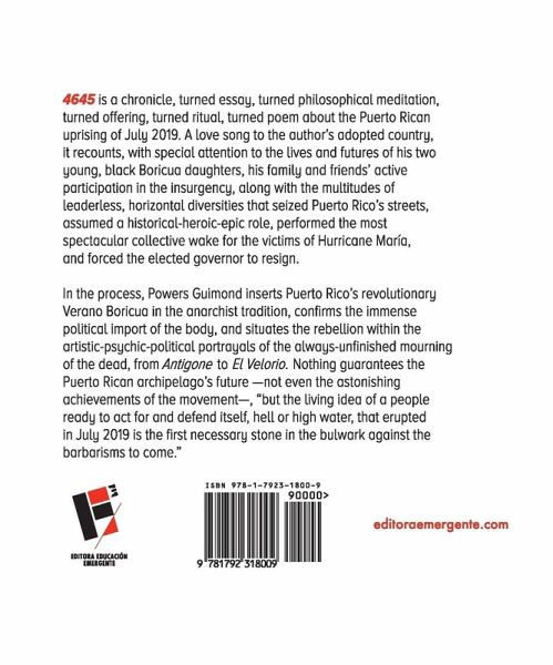 A chronicle on the Puerto Rican uprising of July 2019 which led to the resignation of Governor Ricardo Rossello. The number 4645 refers to the tally popularly accepted as the death toll from Hurricane Maria in September 2017.