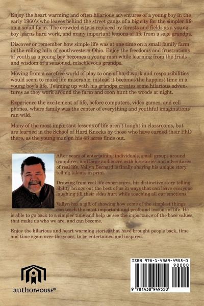 Enjoy the heart warming and often hilarious adventures of a young boy in the early 1960's who leaves behind the street gangs of a big city for the simpler life on a small farm. The crowded city is replaced by forests and fields as a young boy learns hard work, and many important lessons of life from a sage grandpa. Discover or remember how simple life was at one time on a small family farm in the rolling hills of southwestern Ohio. Enjoy the freedoms and frustrations of youth as a young boy becomes a young man while learning from the trials and wisdom of a seasoned, mischievous grandpa. Moving from a carefree world of play to one of hard work and responsibilities would seem to make life miserable, instead it becomes the happiest time in a young boy's life. Teaming up with his grandpa creates some hilarious adventures as they work around the farm and coon hunt the woods at night. Experience the excitement of life, before computers, video games, and cell phones, where family was the center of everything and youthful imaginations ran wild. Many of the most important lessons of life aren't taught in classrooms, but are learned in the School of Hard Knocks by those who have earned their PhD there, as the young man on his 48 acres finds out.