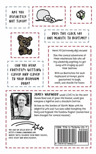 Can you hear footsteps getting closer and closer to your bedroom door? . . . Does the clock say one minute to bedtime? . . . Are you definitely NOT tired yet? . . . Then here's 49 (extremely silly) excuses for staying up past your bedtime! Join the comical adventure of these mischievous kids who will try absolutely anything to get away with staying up past their bedtime. With an illustration for each haphazard attempt, you're guaranteed to laugh, smirk, and chuckle for hours. Disclaimer: reading this eBook will definitely get you into all kinds of trouble! (So if your parents ask where you heard these excuses you didn't hear them from me).