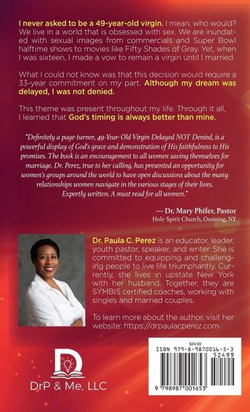 I never asked to be a 49-year-old virgin. I mean, who would? We live in a world that is obsessed with sex. We are inundated with sexual images from commercials and Super Bowl halftime shows to movies like Fifty Shades of Gray. Yet, when I was sixteen, I made a vow to remain a virgin until I married. What I could not know was that this decision would require a 33-year commitment on my part. Although my dream was delayed, I was not denied. This theme was present throughout my life. Through it all, I learned that . . . God's timing is always better than mine. Do you want a resource that gives tips on dating for teens? You found it. If you are looking for dating books for women over 40, this is it. In this memoir, I talk about daring Christian habits that challenges singles to live life God's way. My memoir contains inspirational, personal testimonies of being an overcomer. As a result of my personal growth, I had personal success. Read through the book until the end. I provide tips for Christian living, personal growth, personal success, and family. Dr. Paula C. Perez is an educator, leader, youth pastor, pastor's wife, speaker, and writer. She is committed to equipping and challenging people to live life triumphantly, especially in their relationships. Currently, she lives in upstate New York with her husband. Together, they are SYMBIS certified coaches, working with singles and married couples. To learn more about the author, visit her website. Cover Design: James B. Childs Editor: Libby Gontarz Foreword: Janice J. Burton Reviews: ¿¿Emotionally Gripping The book made me laugh and cry and touched many other emotions. Every young man should read it to understand the long impact of their actions. And every young woman should read it to help draw the red line - and be comfortable in doing so. The book was an easy read but difficult to put down. I highly recommend it! ~79