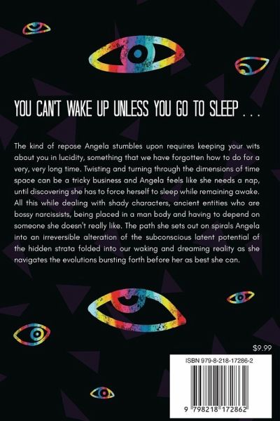 You can't wake up unless you go to sleep... The kind of repose Angela stumbles upon requires keeping your wits about you in lucidity, something that we have forgotten how to do for a very, very long time. Twisting and turning through the dimensions of time space can be a tricky business and Angela feels like she needs a nap, until discovering she has to force herself to sleep while remaining awake. All this while dealing with shady characters, ancient entities who are bossy narcissists, being placed in a man body and having to depend on someone she doesn't really like. The path she sets out on spirals Angela into an irreversible alteration of the subconscious latent potential of the hidden strata folded into our waking and dreaming reality as she navigates the evolutions bursting forth before her as best she can.