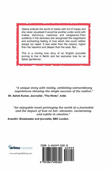 Valerie entered the world of media with full of hopes and she never visualised it would be another under world with malice,dishonour,nastiness,and vengeance.Then suddenly in the darkness she recognized the magnificent and enchanting feeling of love which she could neither accept nor reject. It was wider than the oceans, higher than the heavens and deeper than the seas. But... This is a moving love story of an English journalist coming to live in Berlin and her exclusive love for an Italian gentleman.