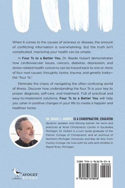 When it comes to the causes of sickness or disease, the amount of conflicting information is overwhelming. But the truth isn't complicated. Improving your health can be simple. In 4Ts to a Better You, Dr. Reade Hubert demonstrates how cardiovascular issues, cancers, diabetes, depression, and stress-related health concerns can be traced back to one or more of four root causes: thoughts, toxins, trauma, and genetic traits-the "four Ts." Eliminate the chaos of navigating the often confusing world of illness. Discover how understanding the four Ts is your key to proper diagnosis, self-care, and treatment. Full of practical and easy-to-implement solutions, 4Ts to a Better You will help you usher in positive changes in your life to create a happier and healthier home.