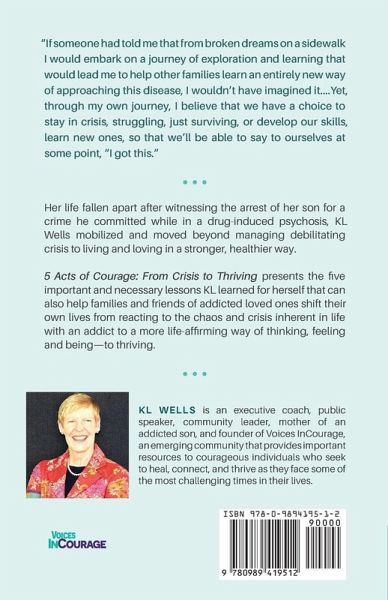 "If someone had told me that from broken dreams on a sidewalk I would embark on a journey of exploration and learning that would lead me to help other families learn an entirely new way of approaching this disease, I wouldn't have imagined it....Yet, through my own journey, I believe that we have a choice to stay in crisis, struggling, just surviving, or develop our skills, learn new ones, so that we'll be able to say to ourselves at some point, "I got this." Her life fallen apart after witnessing the arrest of her son for a crime he committed while in a drug-induced psychosis, KL Wells mobilized and moved beyond managing debilitating crisis to living and loving in a stronger, healthier way. How many of us believe our lives have become only about surviving our loved ones' addiction day to day, feeling desperate to change what's happening, the heart-wrenching pain, the mind-numbing shock? How many of us have been overwhelmed by disbelief, denial, shame, guilt, pain, anger, depression, hopelessness, and resignation-felt all at once in an emotional torrent or in stages, draining us in bits and pieces? How many of us find our lives hijacked by a disease we are ill-prepared to deal with? Having lived through three generations of addiction in her family, KL Wells appears to have been training her entire life to gain the skills to experience her feelings, take care of herself build a community of people who can provide steady support, to explore her own beliefs, and learn everything she could about this disease and what we can do besides feeling frozen with helplessness or engaging in sure-to-fail efforts to control outcomes. As mothers, fathers, spouses, sisters, brothers, grandparents, friends, aunts and uncles, we have been touched in some way by someone we love dealing with Substance Abuse Disorder. Many of us are unprepared to know what next steps we should take to guide us to thrive. KL believes that there are gifts and lessons to be discovered in the countless difficult moments we have faced with our addicted loved one, are facing, and will surely face in the future. This short but impactful book (56 illustrated, full-color pages) lights the way. Taking the First Step... Do you know what you need to take your first healing step on this journey of discovery and transformation? KL Wells invites you to begin with this book. The Five Acts of Courage: From Crisis to Thriving has been written with us in mind and is a reflection of her journey towards a life of healing, thriving, and hope--her wish for us, too. 5 Acts of Courage: From Crisis to Thriving presents the five important and necessary lessons KL learned for herself that can also help families and friends of addicted loved ones shift their own lives from reacting to the chaos and crisis inherent in life with an addict to a more life-affirming way of thinking, feeling and being-to thriving.