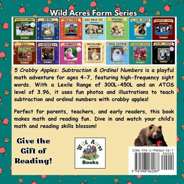 Join us on a fun and educational adventure with 5 Crabby Apples: Subtraction and Ordinal Numbers, a delightful book designed for children ages 4-7. This engaging math adventure combines real pictures and charming illustrations to teach subtraction and ordinal numbers through the antics of the crabby apples. Featuring high-frequency sight words, vibrant visuals, and interactive elements, children will love learning about subtraction and the order of things playfully and memorably. With a Lexile Range of 300L-450L and an ATOS level of 3.96, this book makes math and reading fun and accessible for early readers. Dive into the world of crabby apples and watch your child's skills blossom! Carolyn Wild, a teacher with over 25 years of literacy experience, created the Wild Acres Farm Series. These leveled readers use sight words, picture dictionaries, rhymes, science facts, and math concepts. Inspired by farm life, the award-winning books help children learn to read in homes, schools, and daycares.