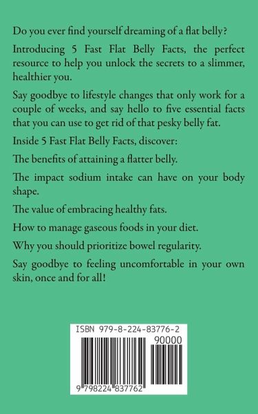 Do you ever find yourself dreaming of a flat belly? Perhaps you have tried to lose that stubborn gut before but to no avail. You've followed exercise plans and been more careful with your food intake, but nothing has ever quite shrunk your stomach. Or maybe you have never committed to getting healthier before, and you want a little more information before you take the leap. Introducing 5 Fast Flat Belly Facts, the perfect resource to help you unlock the secrets to a slimmer, healthier you. Say goodbye to lifestyle changes that only work for a couple of weeks, and say hello to five essential facts that you can use to get rid of that pesky belly fat. The best part? With this information under your belt, you can still enjoy all of your favorite foods in moderation. No more feeling miserable in your weight loss journey! Inside 5 Fast Flat Belly Facts, discover: The benefits of attaining a flatter belly. The impact sodium intake can have on your body shape. The value of embracing healthy fats. How to manage gaseous foods in your diet. Why you should prioritize bowel regularity. Say goodbye to feeling uncomfortable in your own skin, once and for all!