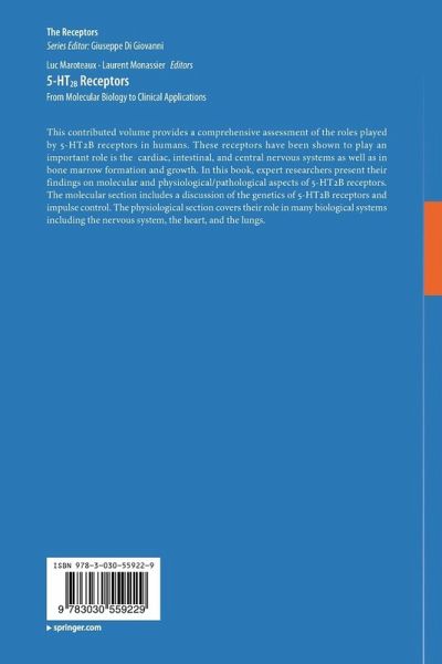 Gene structure, expression, and 5-HT2B receptor signaling.-Serotonin function during embryonic development: the 5-HT2B receptor contribution.- Stem cells to decipher the physiological roles of 5-HT2B receptor signaling.-The serotonergic system in hematopoiesis and hematopoietic disorders.- The 5-HT2B receptor, the immune system and neuroinflammation.-5-HT2B Receptor on Macrophages: What for?.-Bone and 2B Serotonin receptor.-Roles of 5-HT2B receptor in pain.- 5-HT2B receptor, the heart and blood vessels.-5-HT2B receptor in Cardiopulmonary Disease.- Serotonin and cardiac Valves Degeneration in dog.- The discovery of 5-HT2B receptor pharmacology through the understanding of drug- induced valvulopathy.- Serotonin and fibrosis.- 5-HT2B receptors in liver.- Metabolic Regulation: Insulin secretion and action.- Drugs of abuse affecting 5-HT2B receptors.-The Role of 5-HT2B receptor on Aggression and Drugs of Abuse.- Role of the serotonin 2B receptor in the reinforcingeffects of psychostimulants.- Serotonin 2B receptor interactions with dopamine network: implications for therapeutics in schizophrenia.- A Role for the 5-HT2B receptor in the Neurobiology of Schizophrenia.- 5-HT2B receptors and antidepressants.- Serotonin and the 5-HT2B receptor in amyotrophic lateral sclerosis.