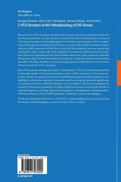 Part of Springer's "The Receptors," series, this text is the first ever overview on the research of 5-HT2c receptors. 5-HT2c receptor research has been productive for twenty-five years, but recent years have seen an extraordinary increase in both amount produced and insight gained. 5-HT2c is a prominent central serotonin receptor subtype widely expressed within the central and the peripheral nervous system and is thought to play a key role in the regulation of numerous behaviors. This text covers the molecular, cellular, anatomical, biochemical and behavioral aspects of this receptor, highlighting its distinctive regulatory properties and the emerging functional significance of constitutive activity and RNA-editing in vivo. It also investigates the receptors' therapeutic potential in many diseases, treated individually in separate chapters, including depression, drug abuse, schizophrenia, eating disorders, Parkinson's disease, Prader-Willi Syndrome, Alzheimer's disease and epilepsy.