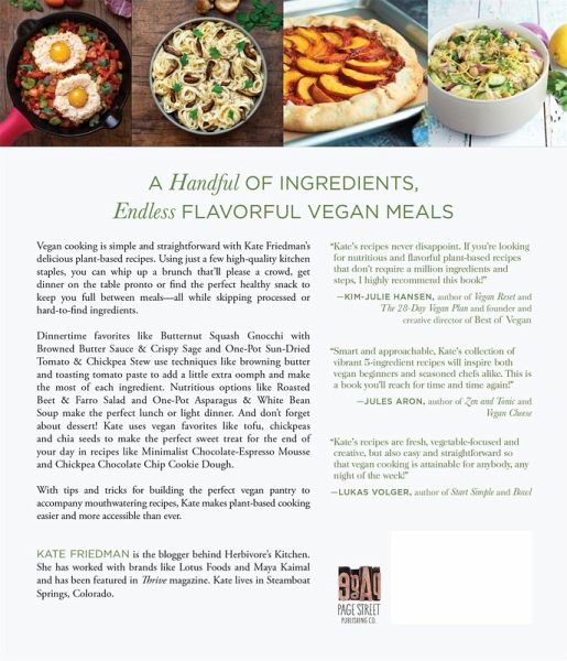 A Handful of Ingredients, Endless Flavorful Vegan Meals Vegan cooking is simple and straightforward with Kate Friedman's delicious plant-based recipes. Using just a few high-quality kitchen staples, you can whip up a brunch that'll please a crowd, get dinner on the table pronto or find the perfect healthy snack to keep you full between meals-all while skipping processed or hard-to-find ingredients. Dinnertime favorites like Butternut Squash Gnocchi with Browned Butter Sauce & Crispy Sage and One-Pot Sun-Dried Tomato & Chickpea Stew use techniques like browning butter and toasting tomato paste to add a little extra oomph and make the most of each ingredient. Nutritious options like Roasted Beet & Farro Salad and One-Pot Asparagus & White Bean Soup make the perfect lunch or light dinner. And don't forget about dessert! Kate uses vegan favorites like tofu, chickpeas and chia seeds to make the perfect sweet treat for the end of your day in recipes like Minimalist Chocolate-Espresso Mousse and Chickpea Chocolate Chip Cookie Dough. With tips and tricks for building the perfect vegan pantry to accompany mouthwatering recipes, Kate makes plant-based cooking easier and more accessible than ever.