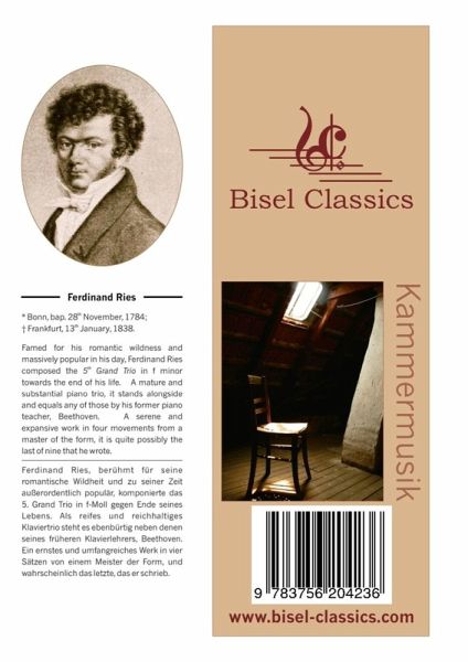 Famed for his romantic wildness and massively popular in his day, Ferdinand Ries composed the 5 Grand Trio in f minor towards the end of his life. A mature and substantial piano trio, it stands alongside and equals any of those by his former piano teacher, Beethoven. A serene and expansive work in four movements from a master of the form, it is quite possibly the last of nine that he wrote.---Ferdinand Ries, berühmt für seine romantische Wildheit und zu seiner Zeit außerordentlich populär, komponierte das 5. Grand Trio in f-Moll gegen Ende seines Lebens. Als reifes und reichhaltiges Klaviertrio steht es ebenbürtig neben denen seines früheren Klavierlehrers, Beethoven. Ein ernstes und umfangreiches Werk in vier Sätzen von einem Meister der Form, und wahrscheinlich das letzte, das er schrieb.