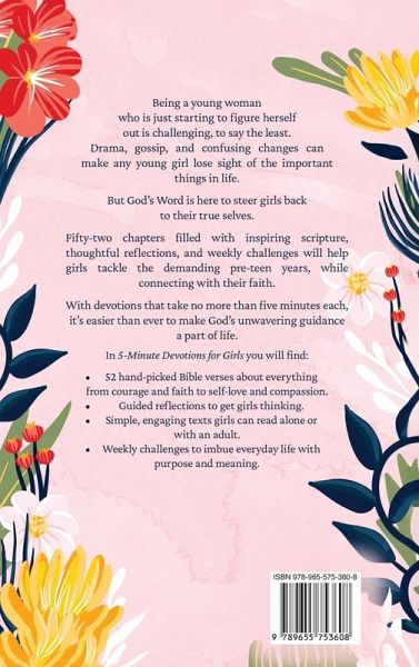 52 weeks of uplifting devotions for girls aged 8 to 12. Being a young woman who is just starting to figure herself out is challenging, to say the least. Drama, gossip, and confusing changes can make any young girl lose sight of the important things in life. But God's Word is here to steer girls back to their true selves. Fifty-two chapters filled with inspiring scripture, thoughtful reflections, and weekly challenges will help girls tackle the demanding pre-teen years, while connecting with their faith. With devotions that take no more than five minutes each, it's easier than ever to make God's unwavering guidance a part of life. In 5-Minute Devotions for Girls you will find: · 52 hand-picked Bible verses about everything from courage and faith to self-love and compassion. · Guided reflections to get girls thinking. · Simple, engaging texts girls can read alone or with an adult. · Weekly challenges to imbue everyday life with purpose and meaning. This is the perfect gift for any 8-12-year-old girl in your life!