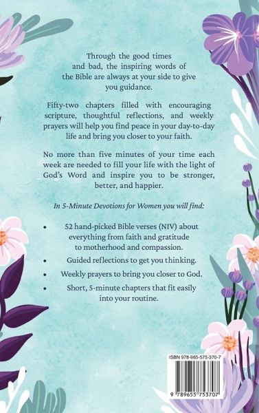 52 weeks of encouraging devotions for Christian women. Through the good times and bad, the inspiring words of the Bible are always at your side to give you guidance. Fifty-two chapters filled with encouraging scripture, thoughtful reflections, and weekly prayers will help you find peace in your day-to-day life and bring you closer to your faith. No more than five minutes of your time each week are needed to fill your life with the light of God's Word and inspire you to be stronger, better, and happier. In 5-Minute Devotions for Women you will find: · 52 hand-picked Bible verses (NIV) about everything from faith and gratitude to motherhood and compassion. · Guided reflections to get you thinking. · Weekly prayers to bring you closer to God. · Short, 5-minute chapters that fit easily into your routine. This is the perfect gift for the devoted woman in your life!