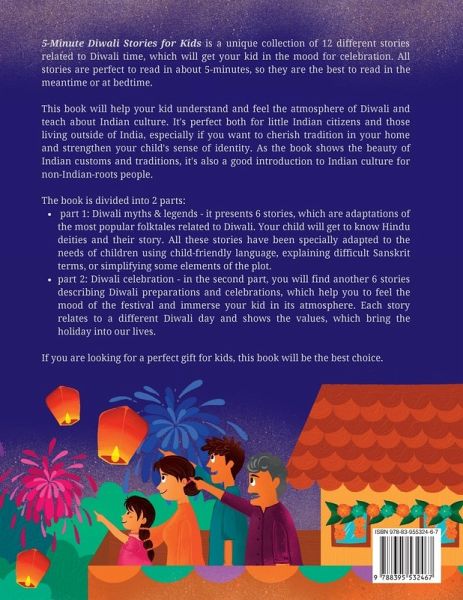 5-Minute Diwali Stories for Kids is a unique collection of 12 different stories related to Diwali time, which will get your kid in the mood for celebration. All stories are perfect to read in about 5-minutes, so they are the best to read in the meantime or at bedtime. This book will help your kid understand and feel the atmosphere of Diwali and teach about Indian culture. It's perfect both for little Indian citizens and those living outside of India, especially if you want to cherish tradition in your home and strengthen your child's sense of identity. As the book shows the beauty of Indian customs and traditions, it's also a good introduction to Indian culture for non-Indian-roots people. The book is divided into 2 parts: - part 1: Diwali myths & legends - it presents 6 stories, which are adaptations of the most popular folktales related to Diwali. Your child will get to know Hindu deities and their story. All these stories have been specially adapted to the needs of children using child-friendly language, explaining difficult Sanskrit terms, or simplifying some elements of the plot. - part 2: Diwali celebration - in the second part, you will find another 6 stories describing Diwali preparations and celebrations, each of which beautifully describe a particular day of the holidays. These stories will help you feel the festival's mood and immerse your kid in the atmosphere of celebration. Each story relates to a different Diwali day and shows the values which the holidays bring into our lives. Some of the stories are easy to understand even for kindergarten children, however, some include more complex details, thus the book will be perfect both for preschoolers and elementary school kids. The book is beautifully illustrated, which helps kids understand each story better. Thanks to the large format, the book is convenient for reading together aloud or as a book for early-reader. If you are looking for a perfect gift for kids, this book will be the best choice. Disclaimer: Please note that Hindu beliefs can vary significantly depending on the region. All the folktales of origin of Diwali are fascinating, but please remember they could differ among different Indian communities. As with every religion and ancient religious works, some very small details may be different from what another person has learned. As this book is aimed at younger children, it does not go too deep into some complex details, especially if they are related to violence or elements that could be difficult to understand for a little-ones audience. As your child gets older, it would be a great time to introduce more advanced interpretation.