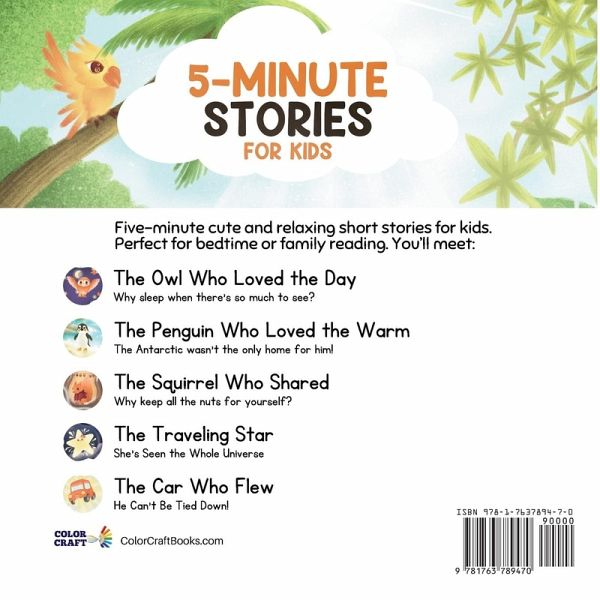 Short Stories for Adventurous Minds Get cozy with five entertaining and relaxing stories-perfect for a five-minute read before bed. Each tale introduces little readers to a loveable animal friend, bringing gentle adventures that make bedtime both fun and calming. This is the second book in our 5-Minute Stories series. 5-Minute Stories For Kids: Tales From The Sky, Forest and Ice is a collection of five adventurous tales filled with charm, color, and magic. Each story is packed with hand-drawn, heartwarming illustrations. Inside, kids will meet:The Owl Who Loved the Day - Ollie, a curious owl, is drawn to the sunlight and embarks on a daytime adventure filled with wonder and discovery! The Penguin Who Loved the Warm - Pip the penguin dreams of sandy beaches and warm waters... but can he find a place where he truly belongs? The Squirrel Who Shared - Nibbles, a generous little squirrel, learns the joy of sharing his supplies by helping friends in a cold winter. The Star Who Traveled - Stella is a bright, adventurous star who zips across the universe, collecting stories to share with her celestial friends and family. The Car Who Flew - Zoom, a spirited little car, discovers his special ability to fly - but only after a good night's sleep. Why Families Love This Collection: Perfect five-minute tales for bedtime: Quick, cozy stories to wind down the day with smiles and wonder. Adorable, memorable characters: Loveable characters brought to life through colorful, hand-drawn illustrations on every page. Stories that speak to young imaginations: Each adventure offers something special - encouraging curiosity, positivity, and joy... with a little extra warmth before sleep. Beautiful, hand-drawn illustrations: Each story comes with unique, hand-drawn illustrations that make kids glow. Bring home the joy of bedtime reading with these five-minute tales that will leave your child dreaming of their next adventure. Order today and make bedtime the most heartwarming part of the day-one short story at a time.