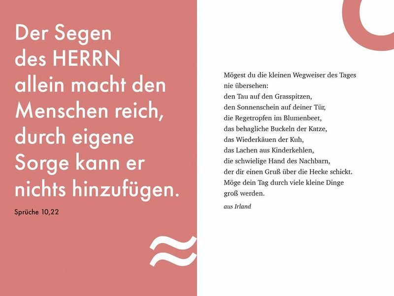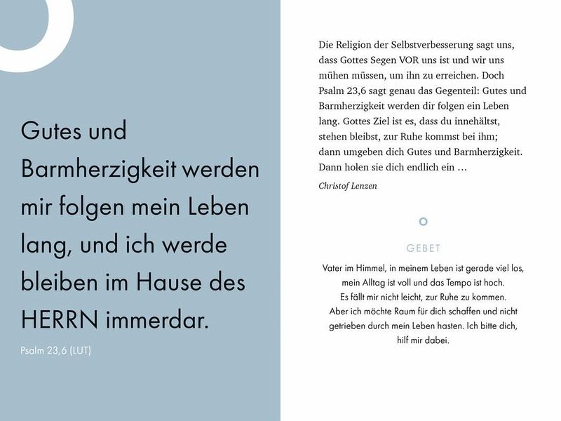 Zum Anfang jedes Impulses ist ein Bibelvers abgedruckt, anschließend ein dazu passendes Zitat einer mehr oder weniger bekannten Persönlichkeit und danach meistens ein Gebet, das entweder so gebetet oder als Einstieg zu einem Gespräch mit Gott genutzt werden kann.