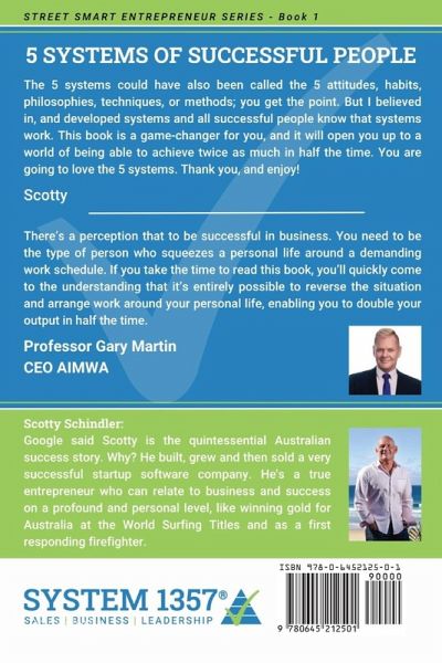 Do you want to achieve twice as much in half the time? Do you want to learn from someone else's experience? Do you want to work smarter, not harder? Awesome! Then here's the good news and the 5 systems that can do just that. These 5 systems were all developed from my own experiences. Over 30 years, I have proved these 5 systems and taught them to many others. And over the years, I have worked with many amazing people in business and sport, and I've seen the fantastic results they achieve, to the point that the 5 systems of successful people almost can't fail. Now I know there is a lot of information out there, so that's why I have turned the complex into 5 simple systems for myself. And long before starting my own company, I believed in these systems. But once I did start my own company, it was time to prove if these systems really did work, and they do! So yes, I will speak a lot from my own real-life experiences. Those lessons from a D-class student who successfully started, developed and exited from a startup company. I leveraged the 5 systems and then retired at the age of 46 when I became financially wealthy, and now do what I want when I want. So I encourage you to know your definition of success, and I want you to leverage these 5 systems to achieve everything you have ever wanted. It's your turn! So, What are the 5 Systems? Now I love the word system, and I believe in systems that people can follow. And the 5 systems could have also been called the 5 attitudes, habits, philosophies, techniques, and methods; you get the point. But I believed in and developed systems, so that's how they will be explained. So what are the 5 systems? 1. Business Judo®Positive Mental Attitude (PMA). Collaboration. Leverage. Win-Win-Win. Network. 2. Time Duplication® This is the one thing every successful person understands! They duplicate themselves, products, and money. 3. Business of Thirds® This is how successful people plan for their success. 4. Rule of 100® These are the checkpoints successful people use to know what they need to do next. The first; 100 seconds, minutes, hours, days, weeks and months. 5. Sugar & Cream® Successful people become the sugar and chase the sugar. Even if they look like cream, they stay sugary. By the end of this book, you will understand the 5 systems. And there is no order for the systems either. However, they are all essential to success, and we can work the systems concurrently or separately to achieve our goals. In other words, these systems work for successful people because they work their systems. And the many stories in this book are shared to help you recognise, relate, assimilate, take action and start using these systems right now. Then share them with as many people as you can. And I know that while reading this book, there is a big chance that you will have at least one epiphany, a rebirth in your thinking. Anyway, that's what happened to me in the 90s when I realised these systems worked. And when I speak to other successful people, they all agree that systems work and the biggest key to success is getting systems in place as early as possible. And there is no better time than now, is there? And if these 5 systems worked for them, they will work for you. And when you succeed at all 5 systems, you too will not only be working smarter rather than harder; you'll also be able to achieve twice as much in half the time. Scotty Schindler