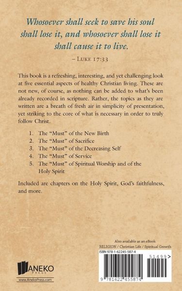 Original Title: Five "Musts" of the Christian Life, and Other Sermons This book is a refreshing, interesting, and yet challenging look at five essential aspects of healthy Christian living. These are not new, of course, as nothing can be added to what's been already recorded in scripture. Rather, the topics as they are written are a breath of fresh air in simplicity of presentation, yet striking to the core of what is necessary in order to truly follow Christ. The "Must" of the New Birth The "Must" of Sacrifice The "Must" of the Decreasing Self The "Must" of Service The "Must" of Spiritual…mehr