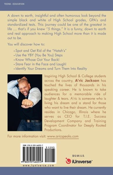 A down to earth, insightful and often humorous look beyond the simple black and white of High School grades, GPA's and standardized tests. This journey could be one of the greatest in life . that's if you knew "5 things." It is a funny, down to earth and real approach to making High School more than it is made out to be. You will discover how to: Spot and Get Rid of the "Hatah's" Use the YBY (You Be You) Steps Know Whose Got Your Back! Stare Fear in the Face and Laugh! Identify Your Dreams and Turn Them Into Reality